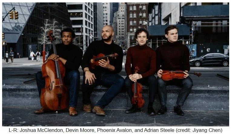 The group — Phoenix Avalon and Adrian Steele, violins; Devin Moore, viola; and Joshua McClendon, cello — has been on a steady rise since winning the first prize and the Haydn prize at the 2022 Banff International String Quartet Competition, and a 2023 Avery Fisher Career Grant.